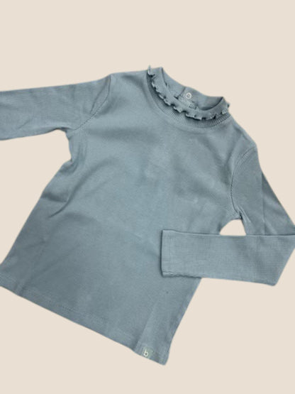 Camiseta canalé azul con cuello volante y manga larga | Boboli